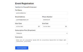 PseudoFill เป็นส่วนขยาย Chrome ฟรีที่ออกแบบมาเพื่อทำให้กระบวนการกรอกแบบฟอร์มด้วยข้อมูลปลอมที่สมจริงเป็นเรื่องง่าย มันมุ่งเน้นไปที่นักพัฒนาและผู้ทดสอบเป็นหลัก ช่วยให้พวกเขาสามารถทำให้การกรอกข้อมูลในฟิลด์ข้อมูล, พื้นที่ข้อความ และเมนูแบบเลื่อนอัตโนมัติ ด้วยการคลิกเพียงครั้งเดียว ผู้ใช้สามารถขจัดงานที่น่าเบื่อในการป้อนข้อมูลทดสอบทั่วไป เช่น ชื่อ, อีเมล, และหมายเลข